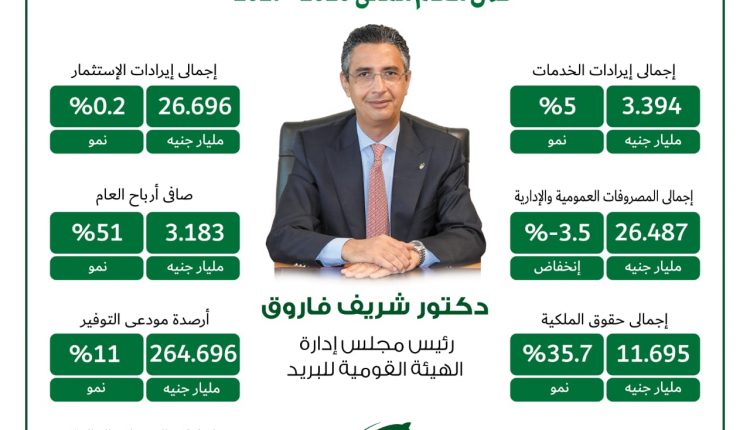 كما بلغت اجمالي الايردات البريدية 0.875 مليار جنيه بمعدل نمو 9 %