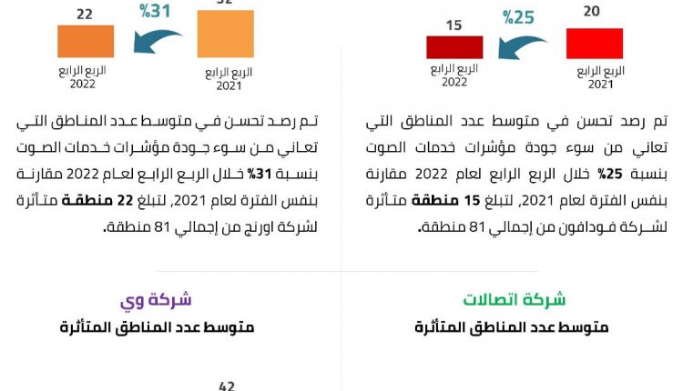 - اتصالات: من أصل 81 منطقة (مدينة وحي) تم اجراء اختبارات القياس عليهم تم رصد تحسن في متوسط عدد المناطق التي تعاني من سوء جودة مؤشرات خدمات الصوت بنسبة 53% خلال الربع الرابع لعام 2022 مقارنة بنفس الفترة لعام 2021، لتبلغ 14 منطقة متأثرة لشركة اتصالات.