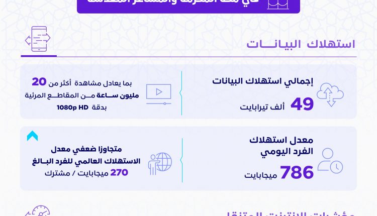 وتضمنت الإحصاءات الصادرة عن الهيئة معدل استهلاك الفرد اليومي للبيانات البالغ 786 ميجابايت، متجاوزًا ضعفي معدل الاستهلاك العالمي للفرد البالغ 270 ميجابايت، وذلك خلال الفترة الممتدة من 1 إلى 11 ذي الحجة.