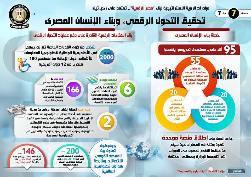 وفيما يتعلق ببناء الكفاءات الرقمية القادرة على دفع عمليات التحول الرقمي، أوضح الإنفوجراف، أنه تم تدريب أكثر من 2000 شخص من ذوي القدرات الخاصة في الأكاديمية الوطنية لتكنولوجيا المعلومات للأشخاص ذوي الإعاقة من ضمنهم 180 متدرباً من 12 دولة أفريقية، كما تم إنشاء 6 مجمعات للإبداع التكنولوجي تضم فروعاً لمعاهد التدريب التابعة لوزارة الاتصالات وتكنولوجيا المعلومات في جامعات إقليمية، وكذلك تم الانتهاء من تطوير 166 مركز شباب تكنولوجياً مع توفير التدريب لـ 22500 متدرب من الشباب على المهارات الأساسية للحاسب الآلي والمهارات الشخصية، وإنشاء المرحلة الأولى من مدينة المعرفة بتكلفة 2 مليار جنيه، وذلك على أحدث النظم التكنولوجية في العاصمة الإدارية الجديدة، والتي ستضم أول جامعة في الشرق الأوسط وإفريقيا، متخصصة في علوم الاتصالات وتكنولوجيا المعلومات، وكذلك مبنى للابتكار والبحوث التطبيقية، ومبنى للتدريب، فضلاً عن مبنى للبحوث والتطوير في التكنولوجيا المساعدة.