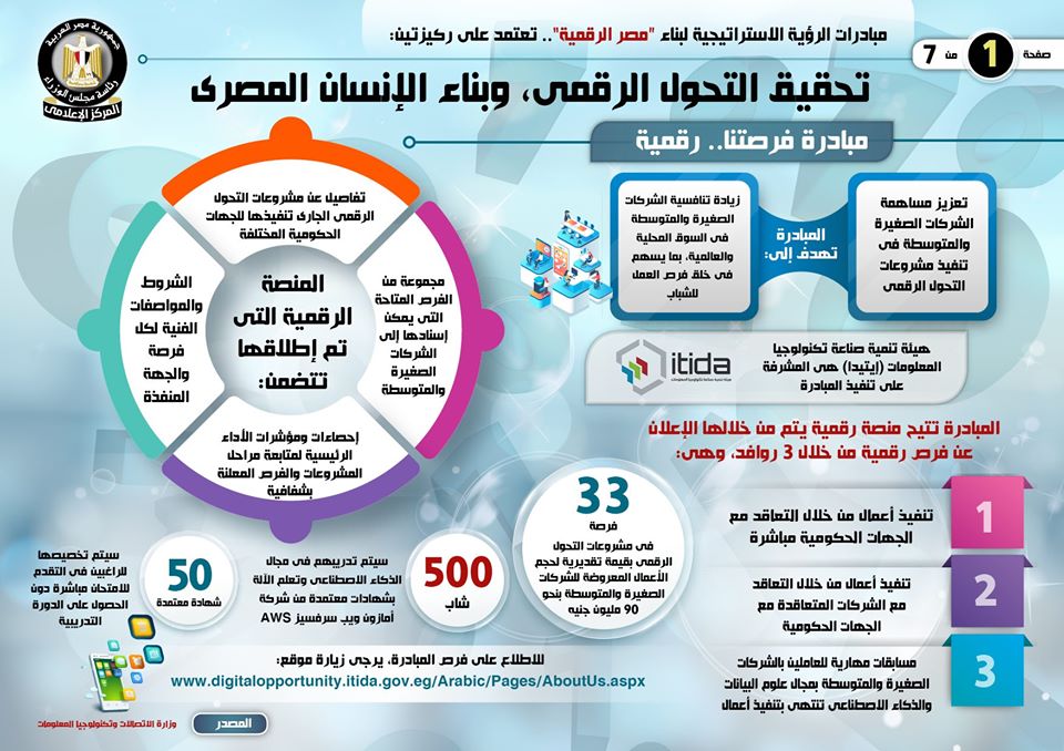 ورصد الإنفوجراف، أنه تم إطلاق مبادرة “مستقبلنا.. رقمي”، والتي تشرف على تنفيذها هيئة تنمية صناعة تكنولوجيا المعلومات