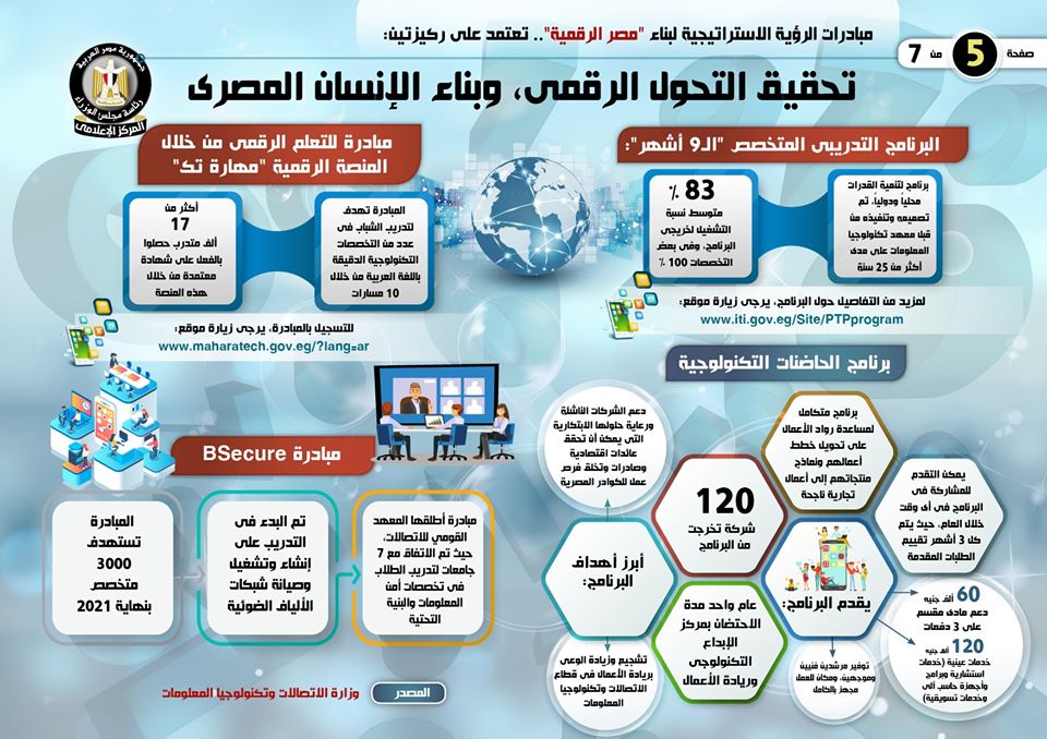 وأبرز الإنفوجراف، إطلاق المعهد القومي للاتصالات مبادرة “BSecure”، حيث تم الاتفاق مع 7 جامعات لتدريب الطلاب في تخصصات أمن المعلومات والبنية التحتية، وقد تم البدء في التدريب على إنشاء وتشغيل وصيانة شبكات الألياف الضوئية، حيث تستهدف المبادرة 3000 متخصص بنهاية 2021.