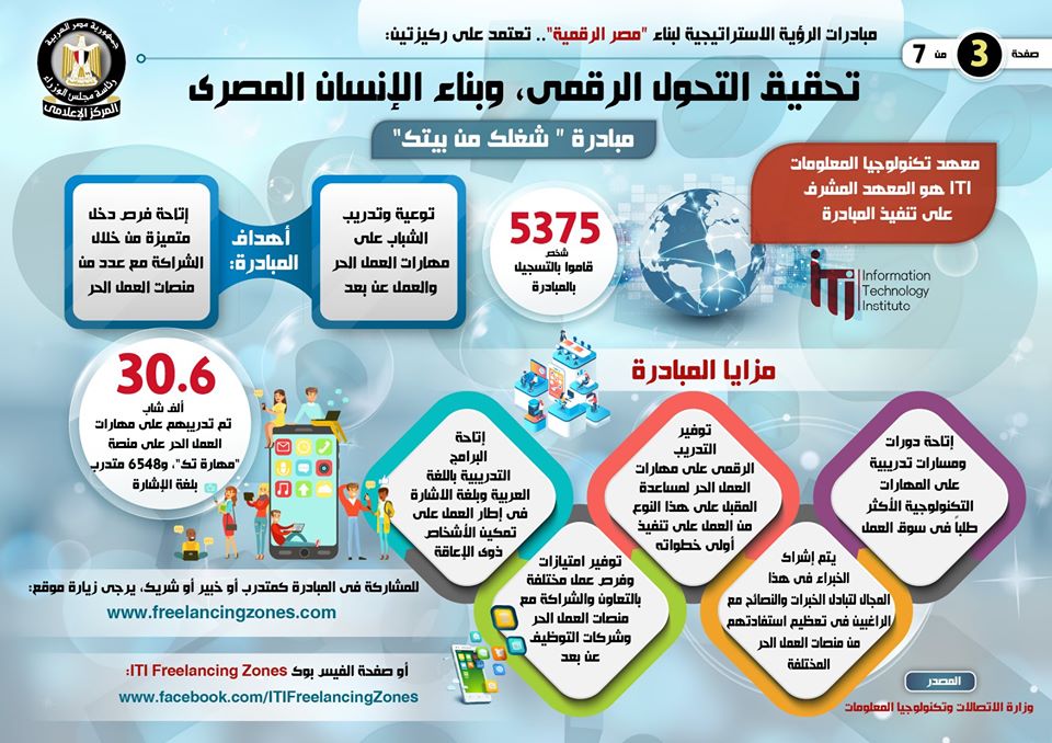 ورصد الإنفوجراف، أنه تم إطلاق مبادرة “شغلك من بيتك”، تحت إشراف معهد تكنولوجيا المعلومات ITI، بهدف توعية وتدريب الشباب على مهارات العمل الحر والعمل عن بعد، وكذلك إتاحة فرص دخل متميزة من خلال الشراكة مع عدد من منصات العمل الحر، وقد بلغ عدد من قاموا بالتسجيل في المبادرة نحو 5375 شخصاً، كما تم تدريب نحو 30.6 ألف شاب على مهارات العمل الحر على منصة “مهارة تك” و6548 متدرباً بلغة الإشارة.