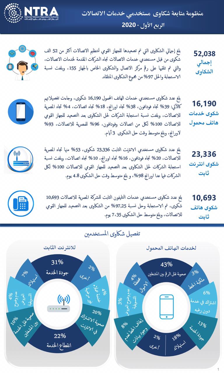 أصدر الجهاز تقرير “منظومة متابعة شكاوى مستخدمي خدمات الاتصالات” خلال الربع الأول من العام الجاري 2020.
