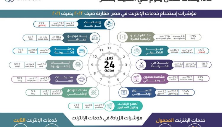 أصدر الجهاز القومي لتنظيم الاتصالات مؤشرات استخدام تطبيقات الإنترنت خلال 24 ساعة في صيف 2022، وبمقارنتها بنفس الفترة من صيف 2021، تبين حدوث زيادة في استخدام خدمات الإنترنت المحمول بنسبة 46% في ظل ارتفاع عدد مستخدمي خدمات الإنترنت المحمول 9.4 مليون مستخدم، كما تبين حدوث زيادة في استخدام خدمات الإنترنت الثابت بنسبة 32% في ظل ارتفاع عدد مستخدمي خدمات الإنترنت الثابت 904 ألف مستخدم.