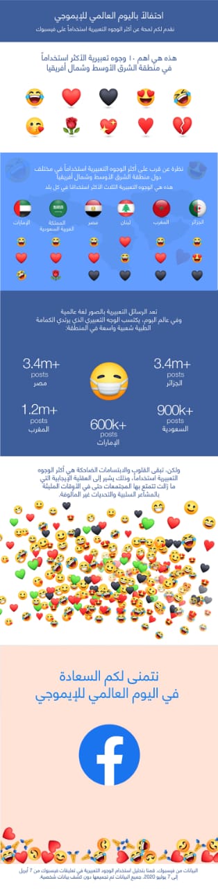 يعتمد سكان هذه المنطقة من العالم بشكل كبير على الوجوه التعبيرية عند النشر والتعليق على فيسبوك. وتأتي عشرة من الوجوه التعبيرية على قائمة الأكثر استخدامًا على مستوى منطقة الشرق الأوسط وشمال إفريقيا وتشمل: وجه بدموع الفرح، قلب أحمر، قلب أسود ثقيل، وجه مبتسم بعيون على شكل قلب، يتدحرج على الأرض ضاحكاً، وجه يرسل قبلة، وردة، قلب لامع، رمز القلب، و قلب مكسور. فالقلوب والوجوه الضاحكة هي أكثر الأشكال التعبير شعبية بين الناس في هذه المنطقة، وهذا يشير إلى العقلية الإيجابية التي ما زالت تتمتع بها المجتمعات حتى في الأوقات المليئة بالمشاعر السلبية والتحديات غير المألوفة.