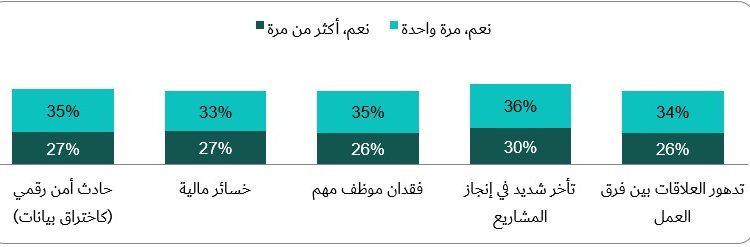 ووفقاً لنتائج الدراسة، فإن جميع الموظفين تقريباً من غير العاملين في مجال تقنية المعلومات (98%) قد تعرّضوا لموقف يتعلق بأمن تقنية المعلومات انطوى على سوء تفاهم. أما في شأن العواقب، فغالباً ما تؤدي إشكاليات التواصل إلى تأخّر كبير في المشاريع (67%) ووقوع حوادث في الأمن الرقمي (62%). وقال نحو ثلث المستطلع آراؤهم (30% و27% على التوالي) أنهم واجهوا هذه المشكلات أكثر من مرة. هذا وتشتمل الآثار السلبية الأخرى على الخسائر المالية، وفقدان موظفين مهمين، وتدهور العلاقات بين فرق العمل، وهي مواقف حدثت لـ 61% من المشاركين في الدراسة.