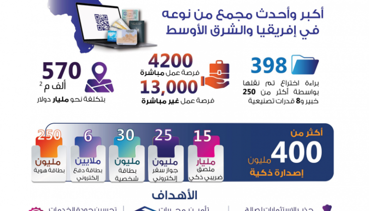 أصدر مجمع الإصدارات الذكية أكثر من 400 مليون إصدارة ذكية منذ إنشائه وحتى إبريل الماضي، ووفق تقرير صادر عن مجلس الوزراء، ووفقًا للتقرير يضم المركز 398 براءة اختراع ويوفر 4200 فرصة عمل مباشرة، ويقع على مساحة 570 ألف متر باستثمارات مليار دولار.