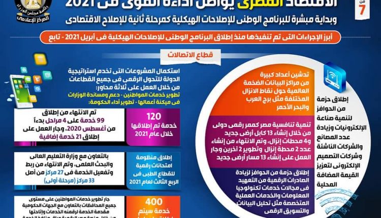 وفي إطار سلسلة تقارير حصاد قطاعات الدولة في 2021، نشر المركز الإعلامي لمجلس الوزراء تقريراً تضمن إنفوجرافات تسلط الضوء على مواصلة الاقتصاد المصري أداءه القوي في 2021 والبداية المبشرة للإصلاحات الهيكلية كمرحلة ثانية للإصلاح الاقتصادي.