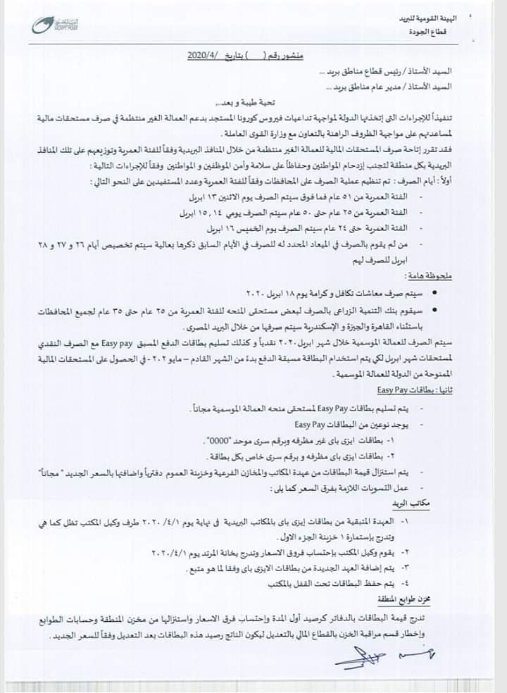 تعتزم الهيئة القومية «للبريد» بدء صرف مستحقات العمالة الموسمية الموجهة من الدولة سيتم صرفها عبر مكاتب الهيئة، بالاعتماد على كروت «Easy Pay» بداية من مايو المقبل، على أن يتم صرف مستحقات شهر إبريل “نقدًا”.