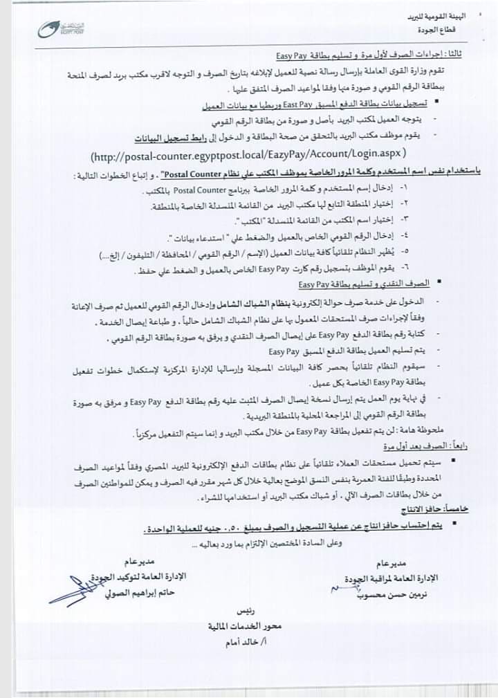 وتطرقت الوثيقة إلى أنه يجب علي العميل التوجه مسبقا إلي أقرب مكتب بريد لتسجيل بطاقة إيزي باي باستخدام بطاقة الرقم القومي وصورة منها.