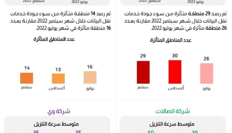 - وي: من أصل 81 منطقة (مدينة وحي) تم اجراء اختبارات القياس عليهم تم رصد إجمالي عدد 14 منطقة تعاني من سوء جودة خدمات البيانات، وعلى رأسها الجيزة والصعيد والاسكندرية، وبمقارنة نتائج اختبارات القياس في شهري يوليو وسبتمبر 2022، لوحظ ثبات في عدد المناطق التي تعاني من سوء جودة خدمات نقل البيانات لتصل إلى 14 منطقة خلال شهري سبتمبر ويوليو 2022، وبلغ متوسط تنزيل البيانات خلال شهر سبتمبر 35 ميجابت/ثانية.