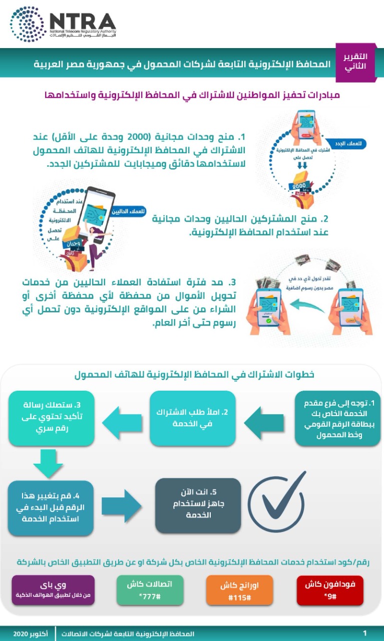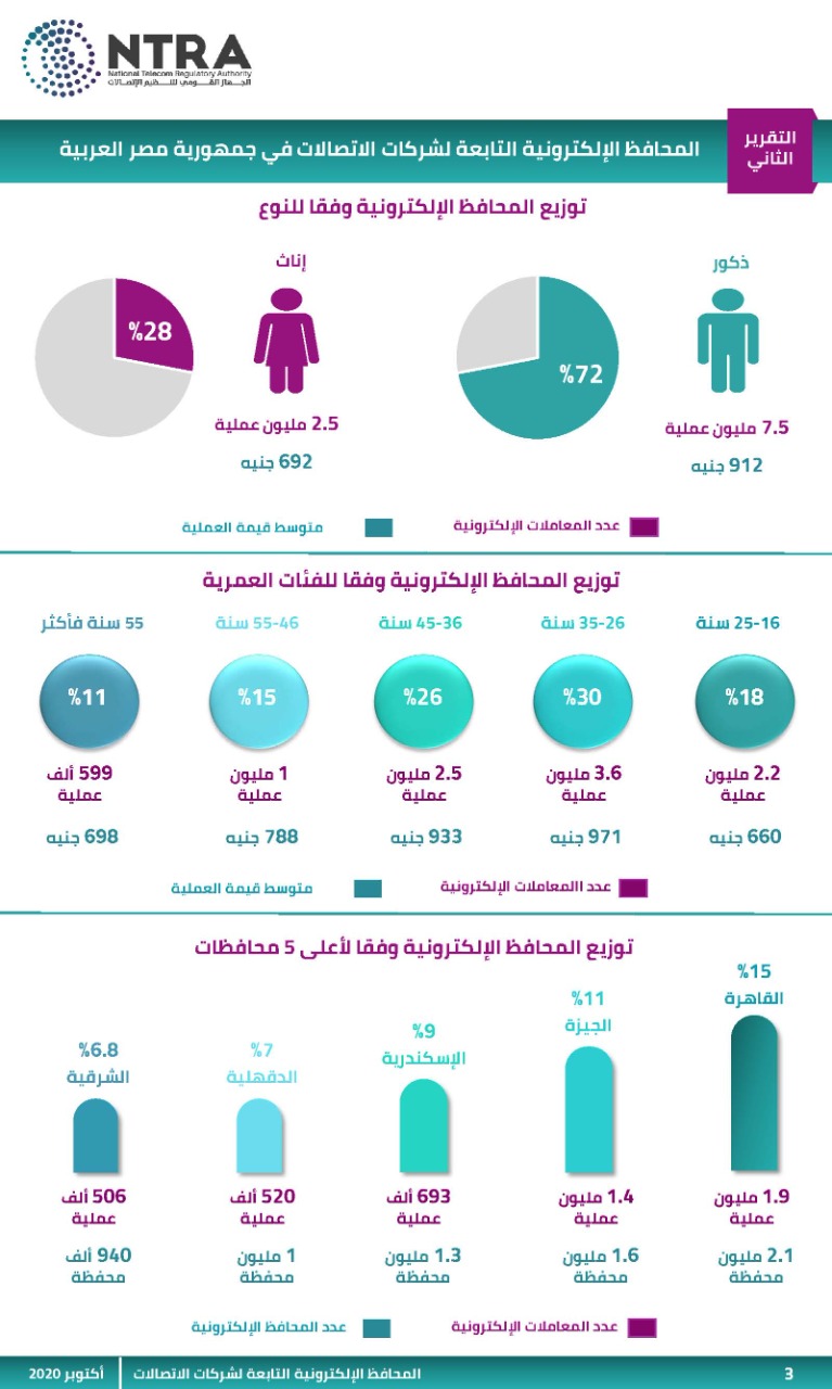 كشف تقرير صادر عن الجهاز القومي لتنظيم الاتصالات حول نشاط المحافظ الإلكترونية عبر المحمول، أنه فيما يتعلق بالتوزيع الجغرافي للمحافظ الإلكترونية للهاتف المحمول على مستوى الجمهورية، فقد لوحظ انتشار الخدمة في جميع المحافظات، وجاءت محافظات القاهرة والجيزة والإسكندرية والدقهلية والشرقية في طليعة المحافظات بنسبة 49% من حاملي المحافظ الإلكترونية للهاتف المحمول، بالإضافة إلى انتشار الخدمة بين كافة الفئات العمرية في المجتمع مع الزيادة النسبية للفئة العمرية من 26-45 عام.