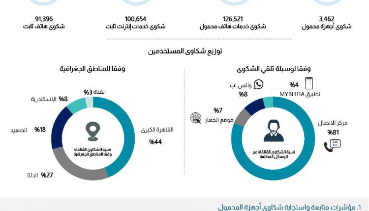 - تم تصعيد 322033 شكوى للجهاز القومي لتنظيم الاتصالات من قِبل المستخدمين تجاه مقدمي خدماتهم، تشمل: 126521 شكوى من خدمات الهاتف المحمول بنسبة 39%، 100654 شكوى من خدمات الانترنت الثابت بنسبة 32%، 91396 شكوى من خدمات الهاتف الثابت بنسبة 28%، 3462 شكوى لأجهزة المحمول بنسبة 1%.