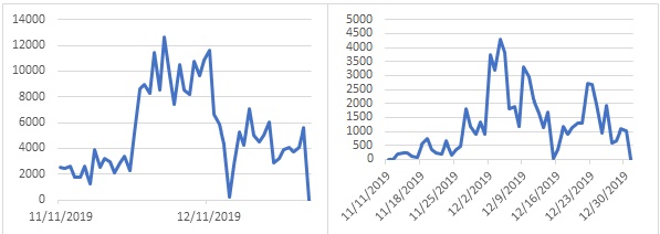 عدد المحاولات المحظورة لزيارة النسخ الوهمية من eBay (يمين) وAlibaba (يسار) من قبل مستخدمي كاسبرسكي
