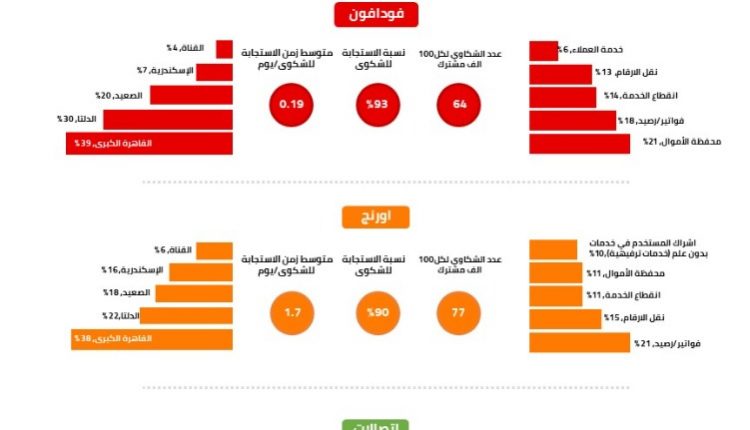 شركة أورنج: بلغ معدل الشكاوى التي تم تصعيدها تجاه شركة أورانج 77 شكوى لكل 100 ألف مشترك، وبلغت نسبة الاستجابة للشكاوى بعد التصعيد للجهاز 90%، وبلغ متوسط وقت الاستجابة للشكوى 1.7 يوم. جاءت أهم شكاوى مستخدمي خدمات الهاتف المحمول تجاه شركة أورنج بنسبة 21% فواتير/رصيد، وبنسبة 15% نقل الأرقام، وبنسبة 11% انقطاع الخدمة، وبنسبة 11% محفظة أموال، وبنسبة 10% اشراك المستخدمين في خدمات بدون علم (خدمات ترفيهية).