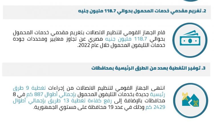 قام الجهاز القومي لتنظيم الاتصالات بتغريم مقدمي خدمات المحمول بحوالي 118.7 مليون جنيه مصري عن تجاوز معايير ومحددات جودة خدمات التليفون المحمول خلال عام 2022.