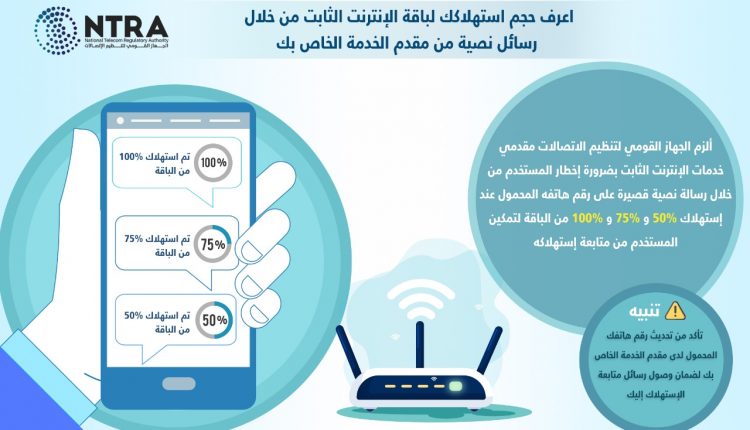 الجهاز القومي لتنظيم الاتصالات يلزم الشركات مقدمي خدمات الانترنت الثابت في السوق المصري بضرورة إعلام المستخدمين بحجم استهلاك الباقة المتعاقد عليها عن طريق رسائل نصية مجانية تصل دورياً على رقم الهاتف المحمول الخاص بالمستخدم والمسجل لدى المشغل، وذلك بما لا يقل عن ثلاث مرات شهرياً تصله عند استهلاك 50% و75% و100% من الباقة.