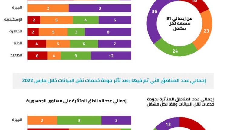 • اتصالات: من أصل 81 منطقة (مدينة وحي) تم اجراء اختبارات القياس عليهم تم رصد 12 منطقة متأثرة من سوء جودة خدمات نقل البيانات خلال شهر مارس 2022 مقارنة بعدد 10 مناطق متأثرة في شهر يناير 2022، وعلى رأسها الصعيد والقاهرة والجيزة، وبلغ متوسط تنزيل البيانات خلال شهر مارس 31 ميجابت/ثانية.