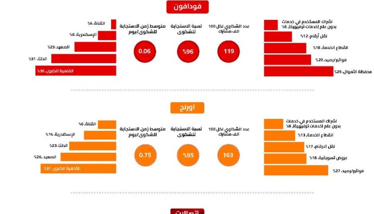 - شركة أورنج: بلغ معدل الشكاوى التي تم تصعيدها تجاه شركة أورانج 163 شكوى لكل 100 ألف مشترك، وبلغت نسبة الاستجابة للشكاوى بعد التصعيد للجهاز 95%، وبلغ متوسط وقت الاستجابة للشكوى 0.75يوم. جاءت أهم شكاوى مستخدمي خدمات الهاتف المحمول تجاه شركة أورنج بنسبة 27% فواتير/رصيد، وبنسبة 18% عروض تسويقية، وبنسبة 17% نقل الأرقام، وبنسبة 13% انقطاع الخدمة، وبنسبة 8% اشراك المستخدمين في خدمات بدون علم.