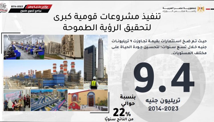قال الدكتور مصطفى مدبولي، رئيس مجلس الوزراء، إن إجمالي الاستثمارات التي تم ضخها على مدار 9 سنوات لتحسين جودة حياة المصريين على مختلف المستويات من خلال مشروعات قومية كبرى بلغت 9.4 تريليون جنيه.