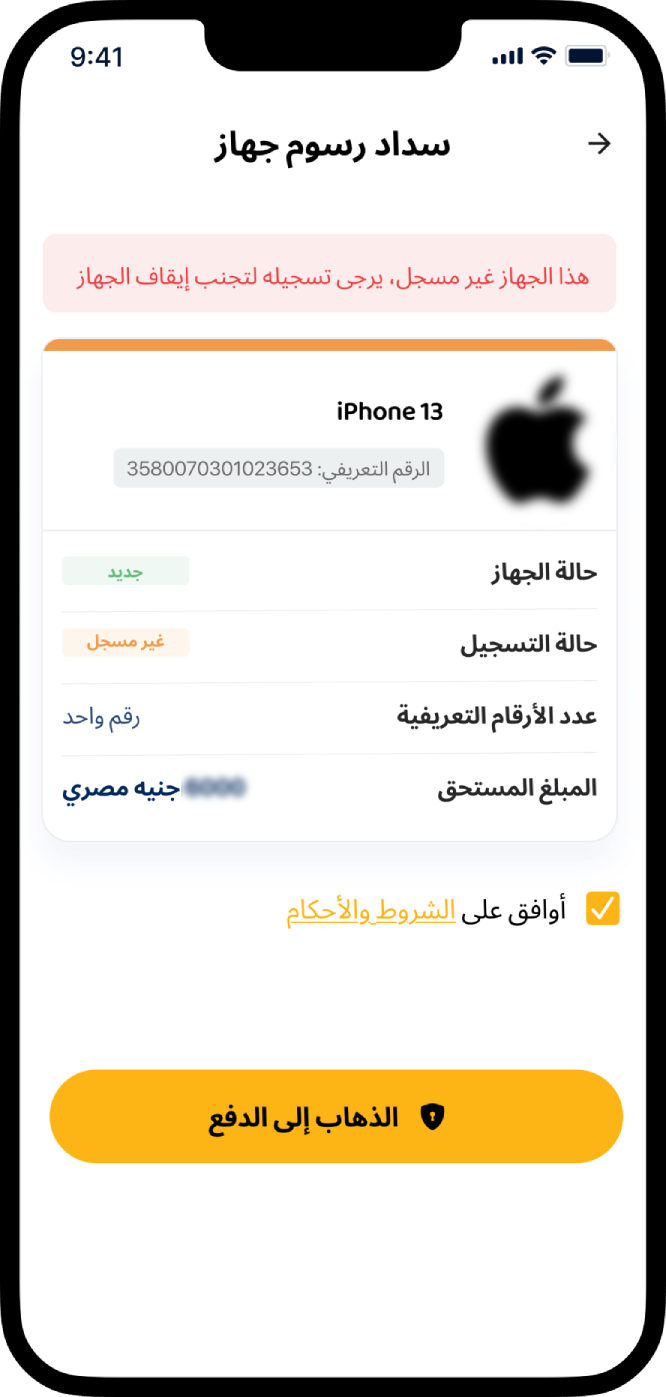 عند استخدام للتطبيق والاستعلام عن جهازي المفعل من قبل وجد أنه يستحق بعض الرسوم وأنه غير مسجل على المنظومة.