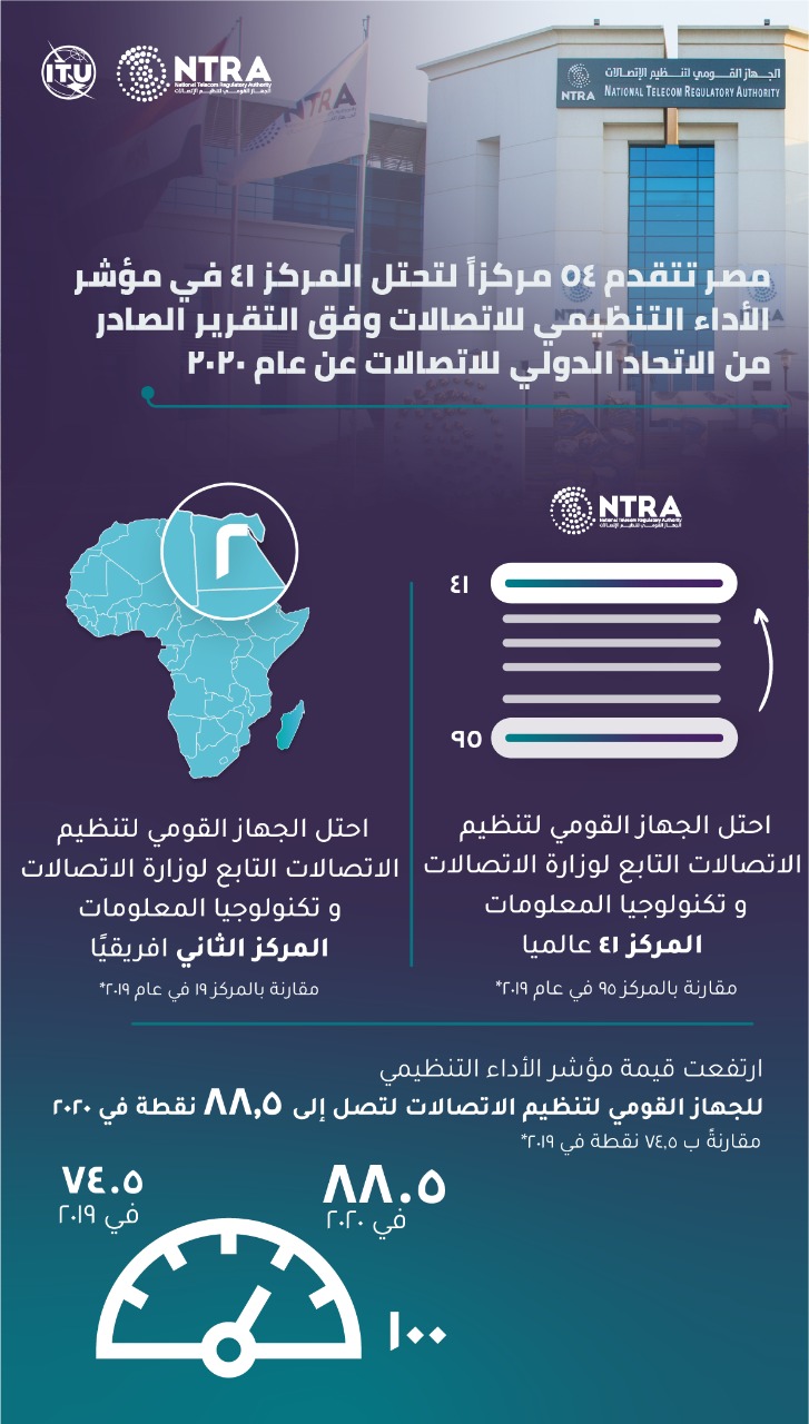 أصدر الاتحاد الدولي للاتصالات تقريره السنوي الخاص بمؤشر أداء منظمي الاتصالات حول العالم لعام 2020 وذلك خلال فعاليات المنتدى العالمي لهيئات تنظيم الاتصالات 2021، حيث تقدم الترتيب الدولي للجهاز القومي لتنظيم الاتصالات بمصر 54 مركزًا بالمؤشر ليصبح في المركز 41 بين 193 دولة مقارنة بالمركز 95 في عام 2019، كما احتل الجهاز المركز الثاني افريقيًا مقارنة بالمركز 19 في عام 2019، حيث ارتفعت قيمة مؤشر الأداء التنظيمي للجهاز القومي لتنظيم الاتصالات لتصل إلى 88.5 نقطة من إجمالي 100 نقطة في ٢٠٢٠ مقارنةً ب 74.5 نقطة في ٢٠١٩.