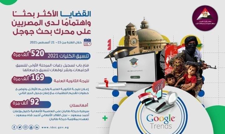 كشف مجلس الوزارء عن وصول عدد مرات مرات البحث عن تنسيق الكليات 2021 على محرك جوجل خلال الفترة من 15 إلي 21 أغسطس الجاري نحو 520 ألف مرة